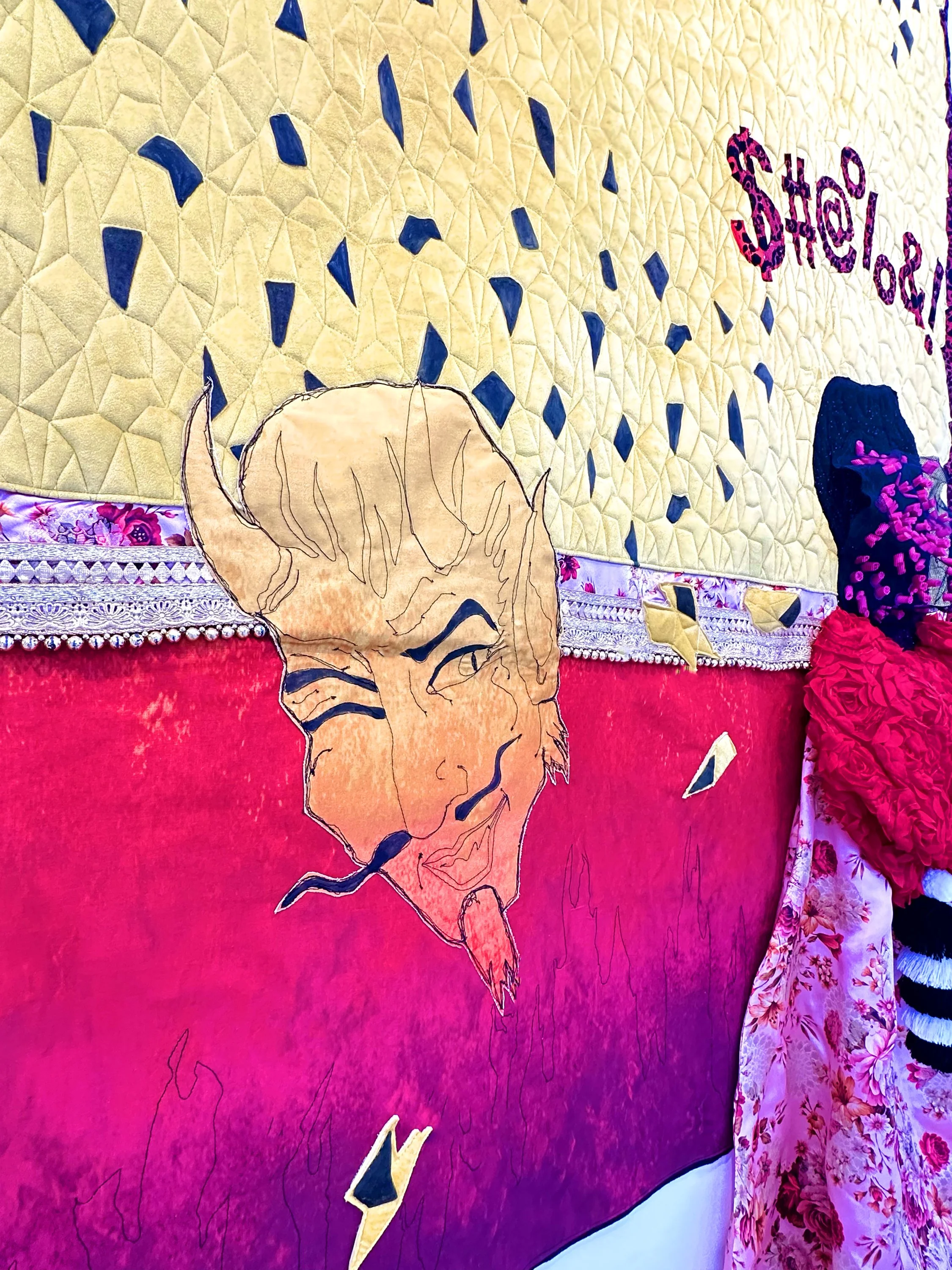 Materials: Canvas, vinyl, assorted new and repurposed fabrics, thread, acrylic paint, dyes, digital images