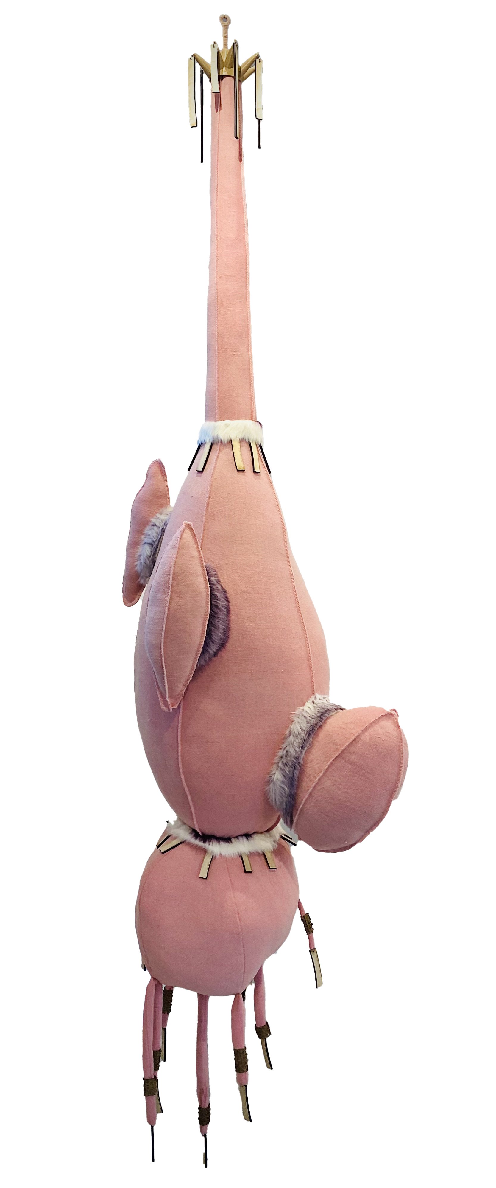Materials: Wool, fabrics, vinyl, thread. Recycled elements: plastic straws, plant stakes, packing materials, strapping tape, bubble wrap, carpet samples, quilts, cut up art pcs. and more