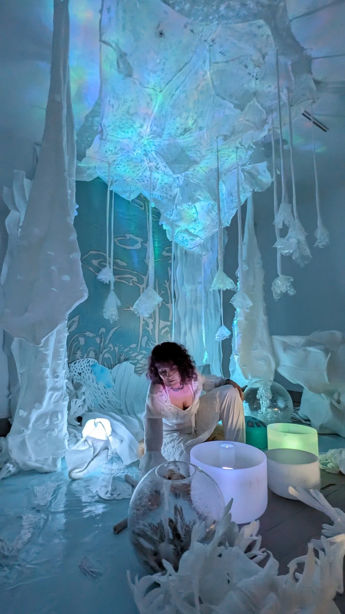 60” X 100” X 6” this view- dimensions variable, hanging variable, too